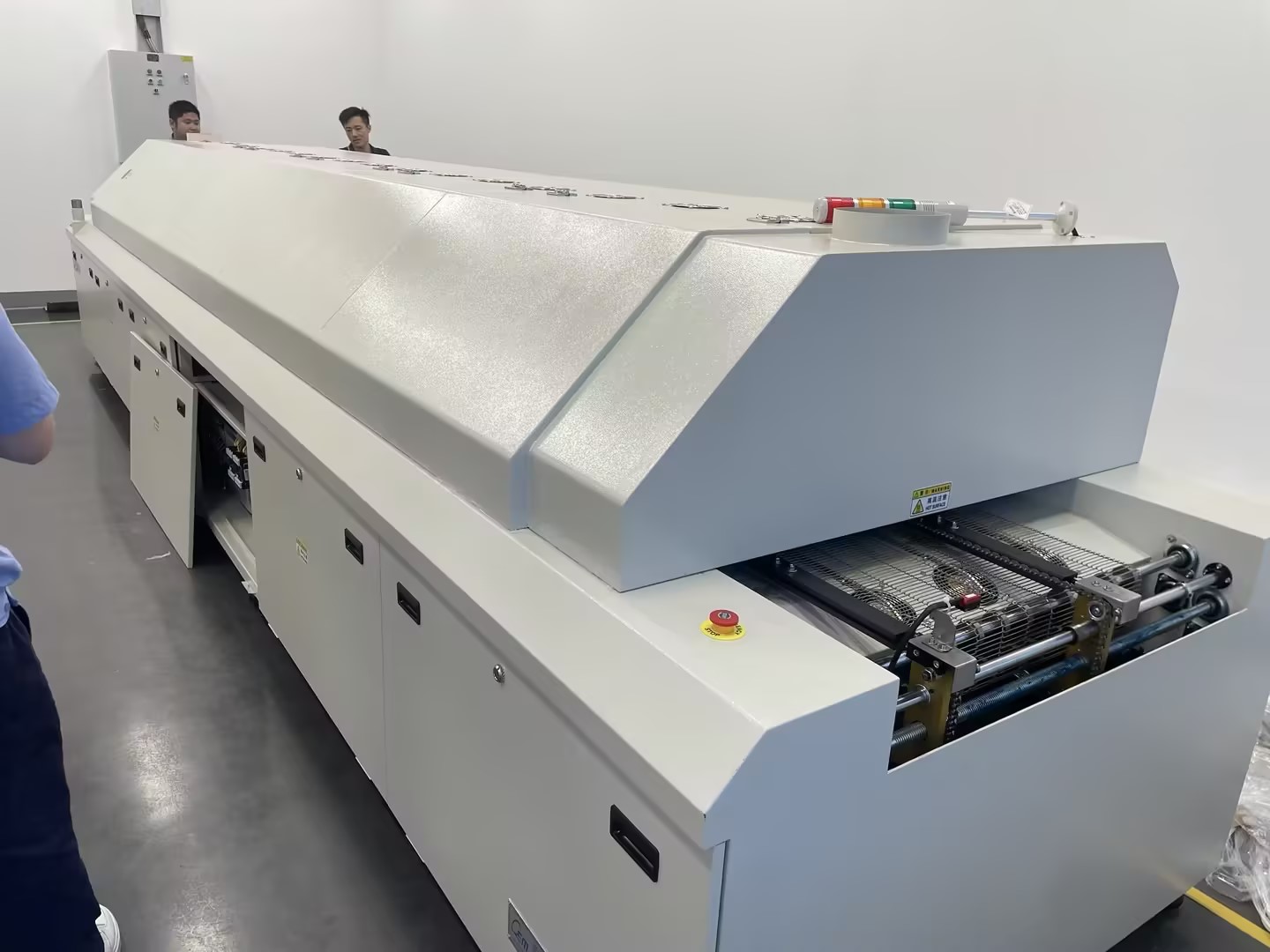 1、回流焊爐故障排除后,合上設(shè)備總電源,順時針旋動紅色蘑菇狀急停開關(guān),即可恢復(fù)返回原工作狀態(tài)。關(guān)機(jī)時不可讓PCB及傳送鋼網(wǎng)帶停止在尚為高溫狀態(tài)下的爐內(nèi),應(yīng)是使機(jī)內(nèi)溫度下降后再停傳送帶!